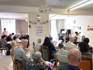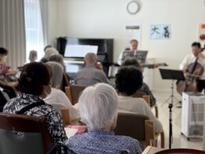 敬老イベント さくら苑 2025年9月20日 ブログ 今年の敬老イベントの一つとして、「ギターとチェロのコンサート」を行いました♪ ギターの弾き語りと、チェロの演奏で会場はウットリ。 生の演奏は、やはり心に響きますね! ご利用者さまもご家族も集まって、皆様懐かしの歌を口ずさんだり 熱心に耳を傾けていらっしゃいました。 演奏してくださったのは、 新春演奏会にもいらしていただいたチェリストの邢 広京さん、 そして今回ギターの弾き語りで平間 寛治さん。 誠にありがとうございました!! また、ぜひ素敵な音楽を聴かせていただけると嬉しいです♪ 「誕生会🎁 」 「敬老の日」