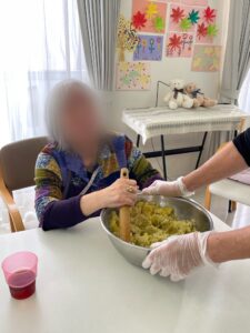 早速入居者T様に、蒸したサツマイモを潰すお手伝いをして頂きました♪♪